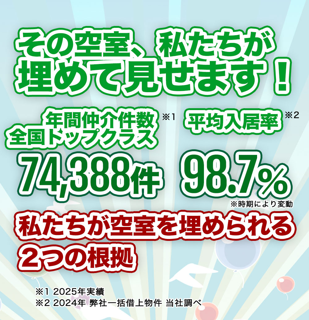 自社ポータルサイトでは常時13万件の情報を公開してWEB集客に努め、業務提携先は大学生協・上場企業など実に170社以上と行うなど、集客の相乗を積極的に狙い、結果として管理物件の平均入居率は98.7%と高い水準を維持しています。